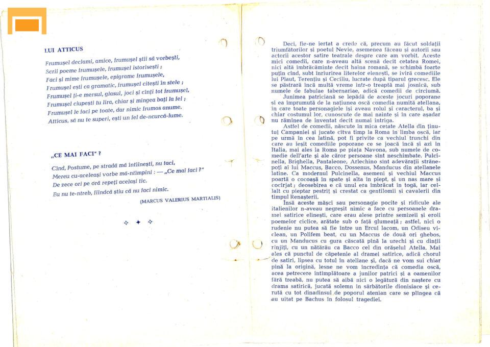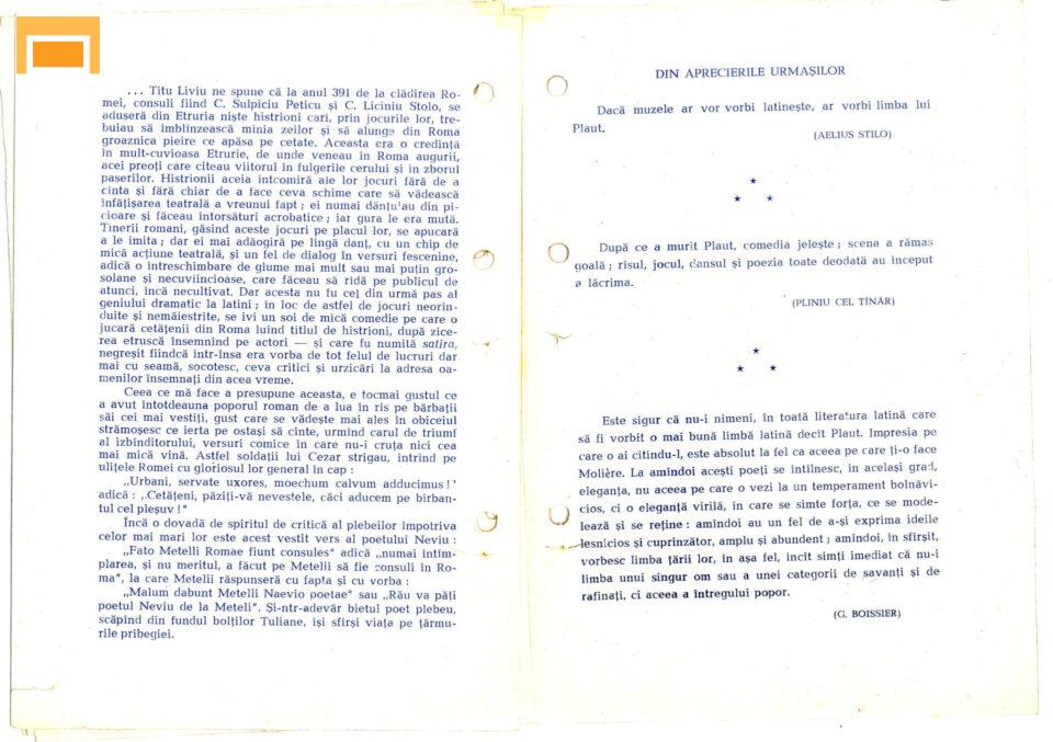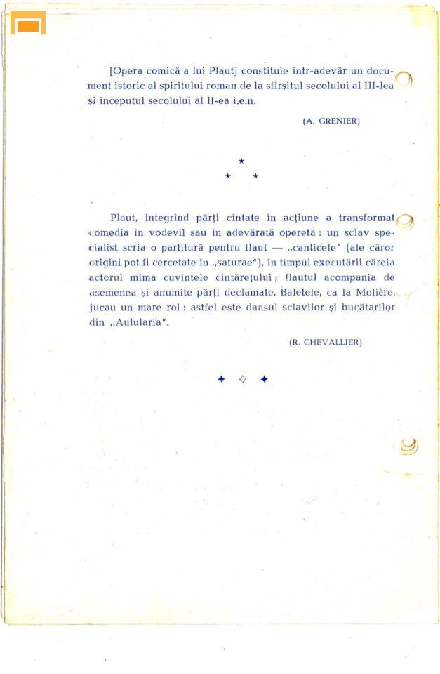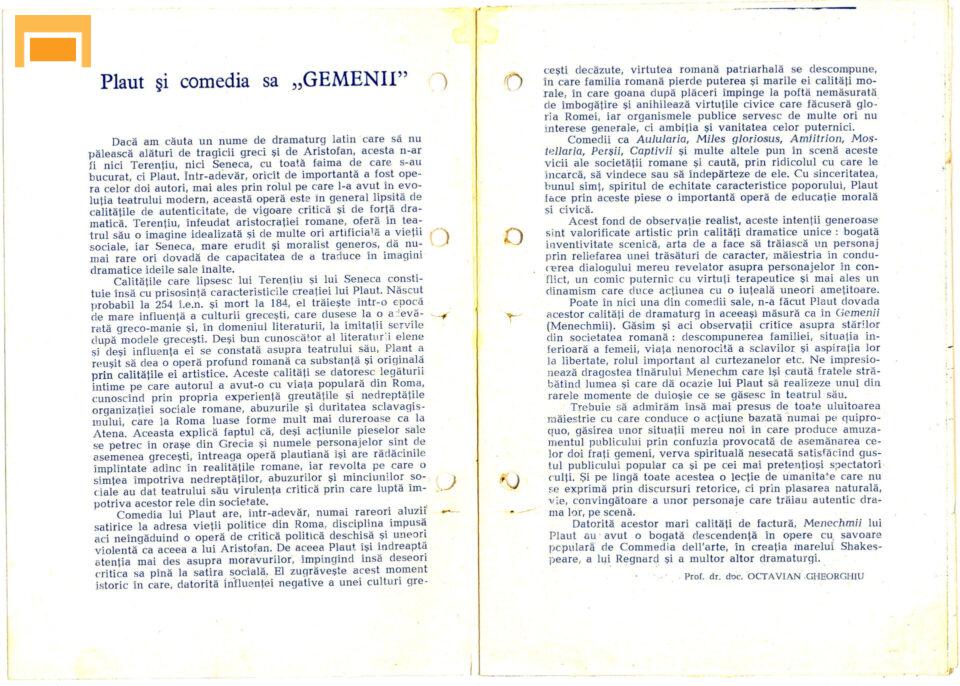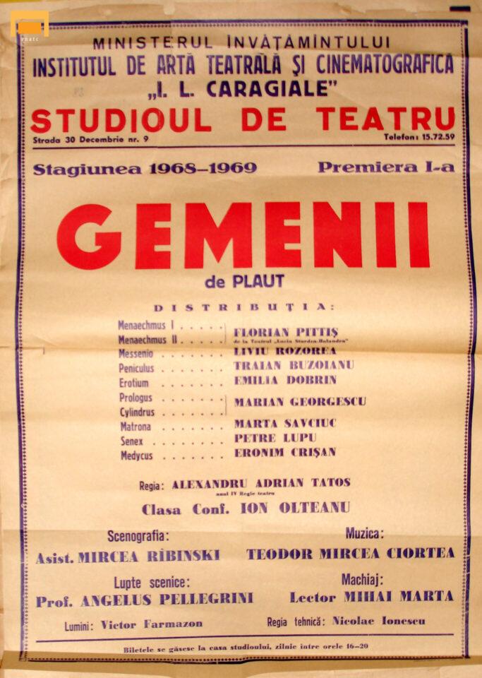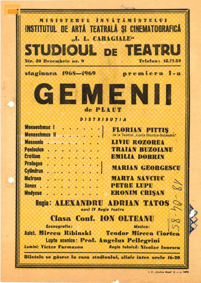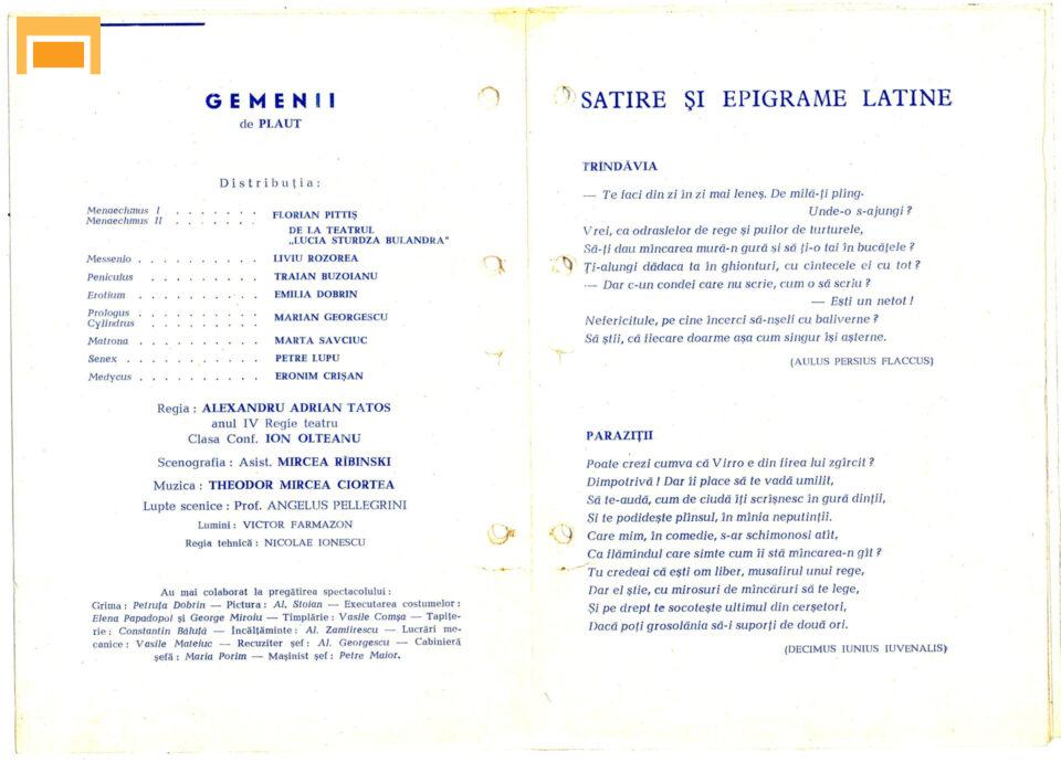 Traian Buzoianu Peniculus Eronim Crişan Medycus Emilia Dobrin Erotium Marian Georgescu Prologus, Cylindrus Petre Lupu Senex Florian Pittiş (Teatrul Bulandra) Menaechmus I, Menaechmus II Liviu Rozorea Messenio Marta Savciuc Matrona